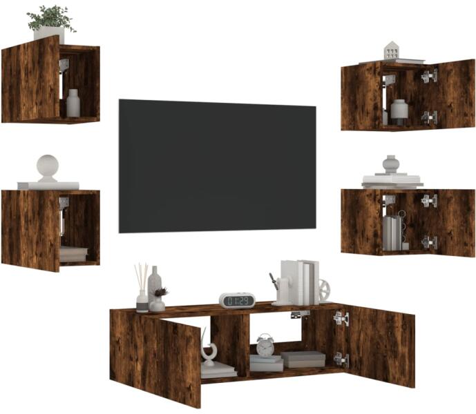 vidaXL 5 darab füstölt tölgyszínű falra szerelhető TV-szekrény LED-del Ezek a LED-es, fali TV-szekrények tökéletesek otthonába a hely maximális kihasználására és a padló tisztán tartására. Tartós anyag: A szerelt fa kivételes minőségű, sima felületű, szilárd, stabil, és ellenáll a nedvességnek. Ezek a szerelt fából készült lebegő TV-szekrények erősek és tart