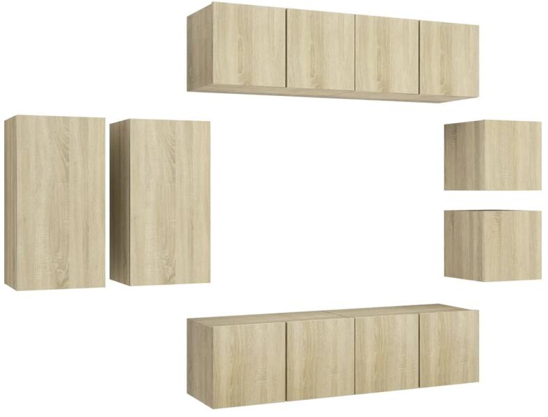 vidaXL 8 részes sonoma-tölgyszínű forgácslap TV-szekrényszett A különféle tárgyak elrendezésére alkalmas, bőséges tárolókapacitással ellátott függő TV-szekrényszett biztosan praktikus és szemet gyönyörködtető kiegészítője lesz otthonának. A TV-szekrény falra szerelhető, így otthona időtlen kiegészítője lesz. Ez a hifi-szekrényszett ideális olyan tárgyak elhe