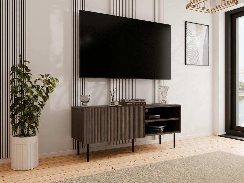 A divatos TV-szekrény praktikus és ideális kiegészítő egy vonzó és modern belső tér kialakításához. Prémium minőségű anyag: A szerelt fa kivételes minőségű, sima felületű, szilárd, stabil és ellenáll a nedvességnek. Bőséges tárolóhely: A sztereószekrény két rekesszel és négy ajtóval rendelkezik a DVD-lejátszók, játékkonzolok, streaming eszközök és média