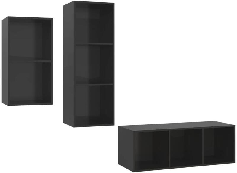 vidaXL 3 részes magasfényű fekete forgácslap TV-szekrény szett A különféle tárgyak elrendezésére alkalmas, bőséges tárolókapacitással ellátott függő TV-szekrényszett biztosan praktikus és szemet gyönyörködtető kiegészítője lesz otthonának. A TV-szekrény falra szerelhető, így otthona időtlen kiegészítője lesz. Ez a hifi-szekrényszett ideális olyan tárgyak elhe