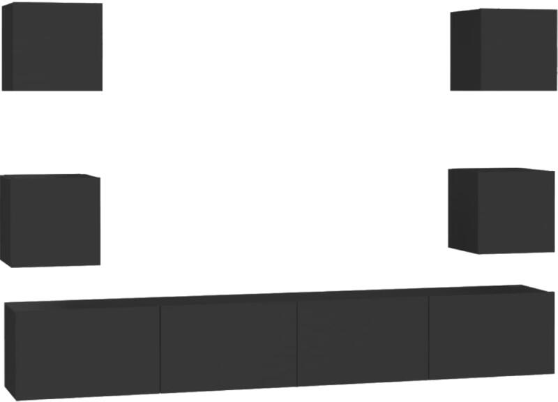 vidaXL 6 részes fekete forgácslap TV-szekrényszett Ez a masszív TV-szekrényszett divatos, mégis praktikus kialakításával garantáltan szobája gyöngyszeme lesz. A TV-állvány a falra rögzíthető, így időtlen kiegészítője lesz otthonának. Széles tárolórekeszei ideálisak könyvek, magazinok, DVD-k és egyéb tárgyak tárolásához. A sztereószekrény nedves ruhával könnyen