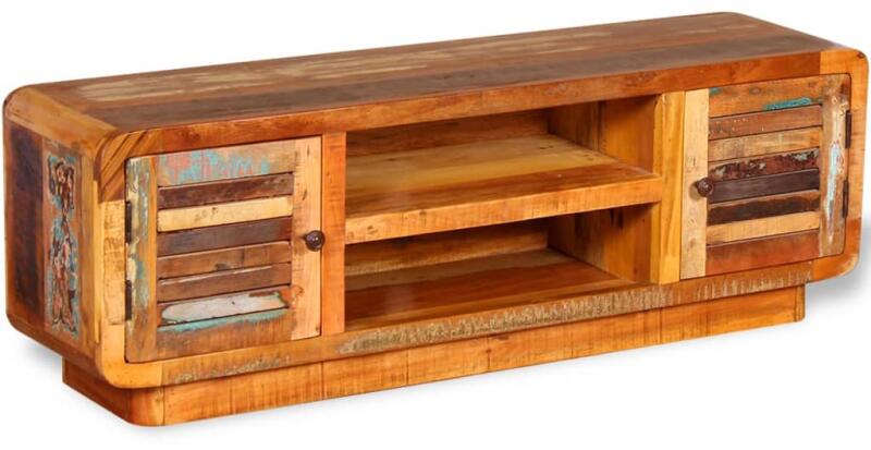 Ez az antik stílusú, fából készült TV-szekrény stílusos és praktikus is egyben a fiókjaival és polcaival. Nagyszerű kiegészítője lehet a nappalinak vagy hálószobának. Ez a TV-szekrény újrahasznosított fából készült, aminek köszönhetően minden darab egyedi, és kissé különbözik egymástól. Az újrahasznosított fából készült bútorok magukon viselik több fafajt