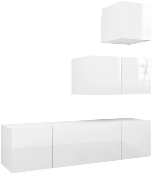 vidaXL 4 részes magasfényű fehér forgácslap TV-szekrényszett Ez a modern kivitelezésű, tágas tárolórésszel rendelkező TV-szekrényszett nappalija középpontja lesz. Ez a függő TV-szekrényszett forgácslapból készült, így erős és tartós. A falra szerelhető szekrényszett időtálló kiegészítője lesz otthonának. A garnitúra számos rekesszel rendelkezik, melyek nagysze