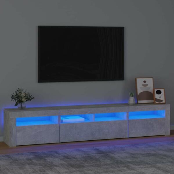 Betonszürke TV-szekrény LED lámpákkal 210x35x40 cm Ez a stílusos, mégis praktikus kialakítású LED-lámpákkal ellátott TV-szekrény minden bizonnyal szobája középpontjává fog válni. Praktikus anyag: A szerelt fa kivételes minőségű, sima felületű, szilárd, stabil, és ellenáll a nedvességnek. Színes LED-világítás: A TV-állvány RGB LED-világítással lett ellátva, am