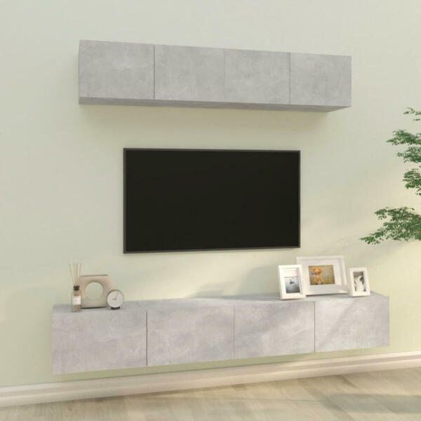 vidaXL 4 részes betonszürke szerelt fa TV-szekrényszett Ez a klasszikus TV-szekrényszett divatos és praktikus kialakításával garantáltan a szoba gyöngyszeme lesz. Erős anyag: A szerelt fa kivételes minőségű, sima felületű, szilárd, stabil, és ellenáll a nedvességnek. Bőséges tárolóhely: A TV-állvány bőséges helyet biztosít magazinjai, DVD-i és egyéb holmijai rendeze