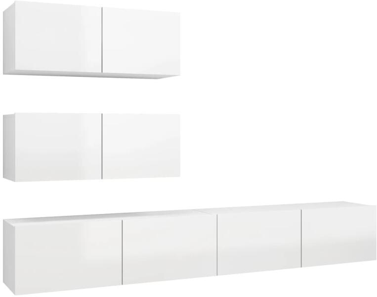 vidaXL 4 részes magasfényű fehér forgácslap TV-szekrényszett Ez a modern kivitelezésű, tágas tárolórésszel rendelkező TV-szekrényszett nappalija középpontja lesz. Ez a függő TV-szekrényszett forgácslapból készült, így erős és tartós. A falra szerelhető szekrényszett időtálló kiegészítője lesz otthonának. A garnitúra számos rekesszel rendelkezik, melyek nagysze