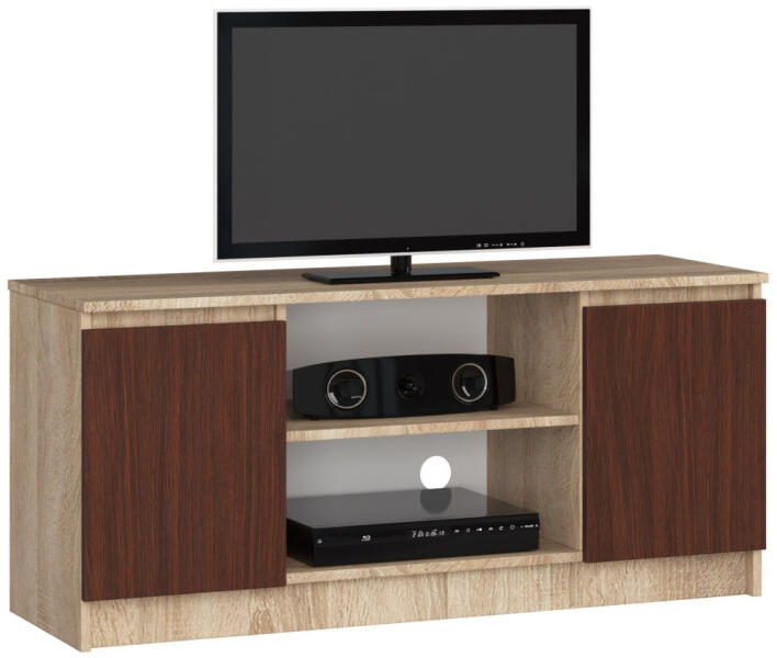 Modern TV-szekrény sonoma tölgy és wenge színkombinációban, amely tökéletes megoldást nyújt a nappali szórakoztató elektronikai eszközeinek tárolására. A 120 cm széles szekrény két ajtóval és praktikus nyitott polcokkal rendelkezik. Stílusos és praktikus TV-szekrény modern otthonokbaEz a modern vonalvezetésű TV-szekrény tökéletesen ötvözi a funkcionalitást és az es