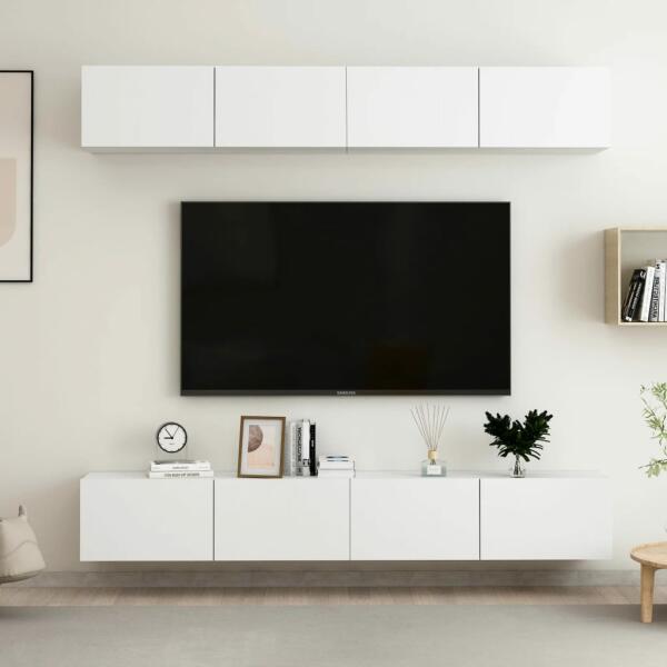 vidaXL 4 db fehér forgácslap TV-szekrény 100 x 30 x 30 cm Ez a masszív TV-szekrényszett divatos, mégis praktikus kialakításával garantáltan szobája gyöngyszeme lesz. A TV-állvány a falra rögzíthető, így időtlen kiegészítője lesz otthonának. Széles tárolórekeszei ideálisak könyvek, magazinok, DVD-k és egyéb tárgyak tárolásához. A sztereószekrény nedves ruhával k