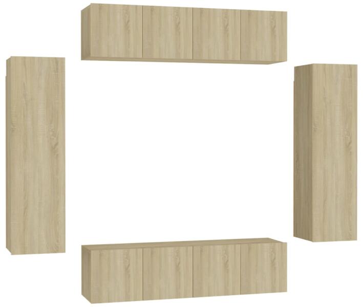 vidaXL 7 részes sonoma-tölgyszínű forgácslap TV-szekrényszett Ez a modern tervezésű és bőséges tárolóhellyel rendelkező TV-szekrényszett nappalija középpontja lesz. Ez a függő TV-szekrényszett szerelt faból készült, így erős és tartós. A falra szerelhető szekrényszett időtálló kiegészítője lesz otthonának. A garnitúra számos rekesszel rendelkezik, melyek nagys
