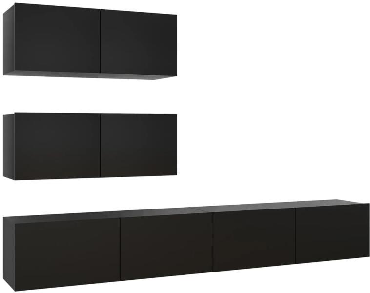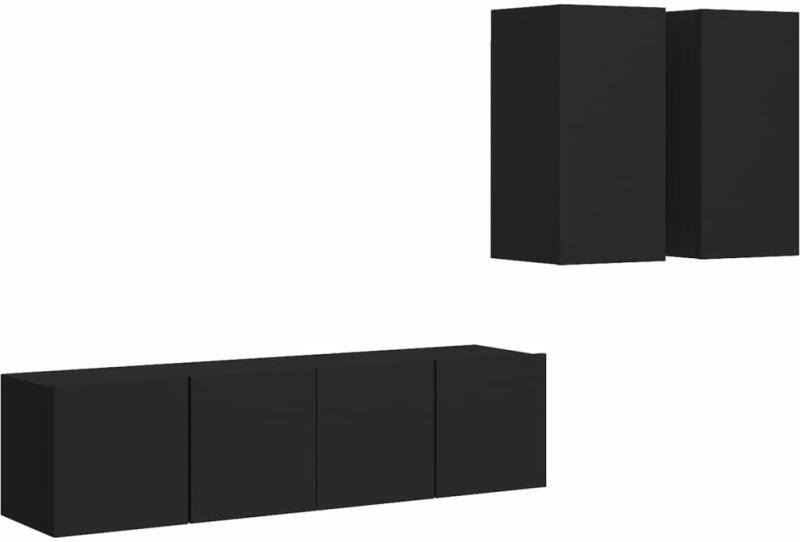 vidaXL 4 részes fekete forgácslap TV-szekrényszett Ez a modern kivitelezésű, tágas tárolórésszel rendelkező TV-szekrényszett nappalija középpontja lesz. Ez a függő TV-szekrényszett forgácslapból készült, így erős és tartós. A falra szerelhető szekrényszett időtálló kiegészítője lesz otthonának. A garnitúra számos rekesszel rendelkezik, melyek nagyszerű tárolóh