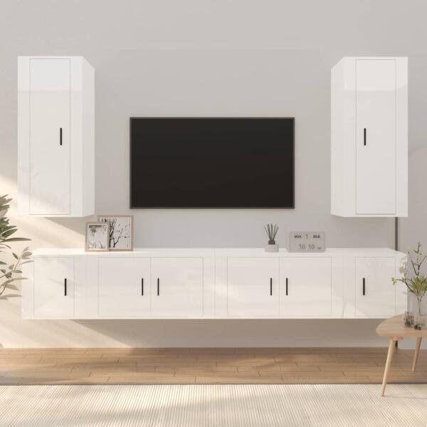 vidaXL 6 részes magasfényű fehér szerelt fa TV-szekrényszett Ez a klasszikus TV-szekrényszett divatos és praktikus kialakításával garantáltan a szoba gyöngyszeme lesz. Masszív anyag: A szerelt fa kivételes minőségű, sima felületű, szilárd, stabil, és ellenáll a nedvességnek. Ezek a szerelt fából készült TV-állványok könnyen tisztíthatók. Bőséges tárolóhely: A TV