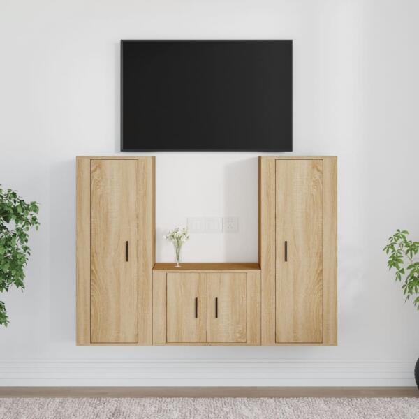 vidaXL 3 részes sonoma tölgy színű szerelt fa TV-szekrényszett Ez a klasszikus TV-szekrényszett divatos és praktikus kialakításával garantáltan a szoba gyöngyszeme lesz. Masszív anyag: A szerelt fa kivételes minőségű, sima felületű, szilárd, stabil, és ellenáll a nedvességnek. Ezek a szerelt fából készült TV-állványok könnyen tisztíthatók. Bőséges tárolóhely: A