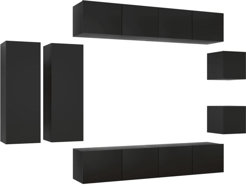 vidaXL 8 részes fekete forgácslap TV-szekrényszett A különféle tárgyak elrendezésére alkalmas, bőséges tárolókapacitással ellátott függő TV-szekrényszett biztosan praktikus és szemet gyönyörködtető kiegészítője lesz otthonának. A TV-szekrény falra szerelhető, így otthona időtlen kiegészítője lesz. Ez a hifi-szekrényszett ideális olyan tárgyak elhelyezésére va