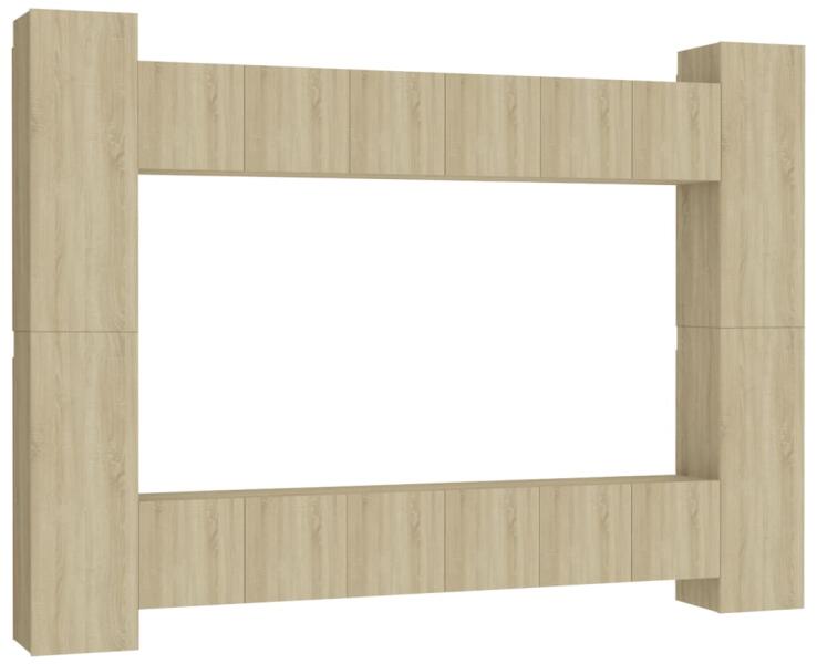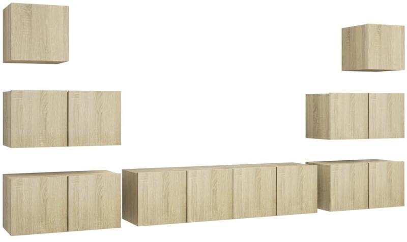 vidaXL 8 részes sonoma-tölgyszínű forgácslap TV-szekrényszett Ez a modern kivitelezésű, tágas tárolórésszel rendelkező TV-szekrényszett nappalija középpontja lesz. Ez a függő TV-szekrényszett forgácslapból készült, így erős és tartós. A falra szerelhető szekrényszett időtálló kiegészítője lesz otthonának. A garnitúra számos rekesszel rendelkezik, melyek nagysz