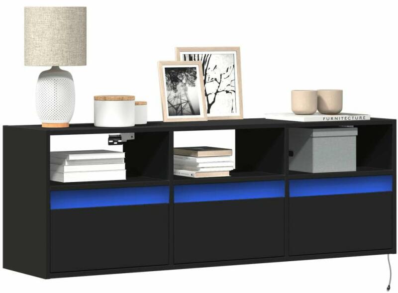 vidaXL fekete fali TV-szekrény LED-világítással 130x31x45 cm Ez a fali szekrény tökéletes az otthonába a hely maximális kihasználására és a padló tisztán tartására. Stabil és tartós anyag: A szerelt fa tartós és stabil anyag sima felülettel, amely ellenáll a nedvességnek, a vetemedésnek és a hasadásnak, így megbízható választás különféle célokhoz. RGB LED-világ