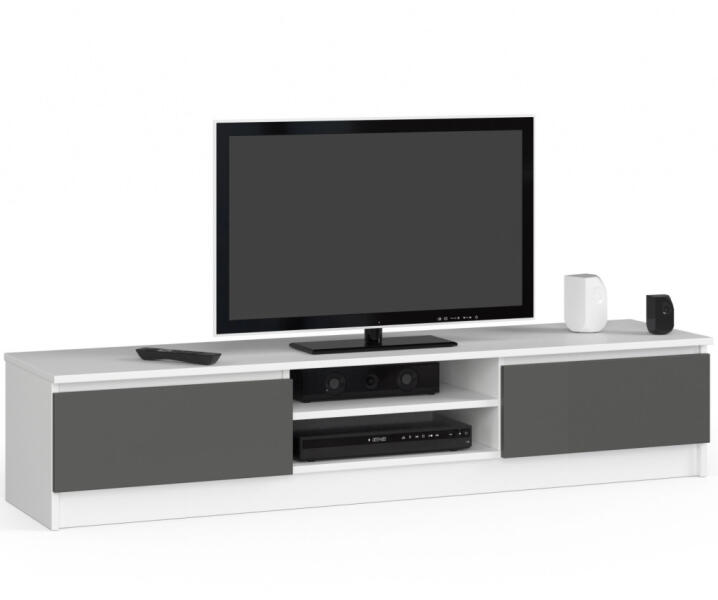 Modern, 160 cm-es TV-állvány beépített tárolóhellyel és nyitott polcokkal. Fehér matt korpusz és grafitszürke ajtófrontok kombinációja tökéletes megoldást nyújt a nappali elektronikai eszközeinek tárolására és rendszerezésére. Elegáns és praktikus TV-állvány modern otthonokbaA CLP sorozat 160 cm-es TV-szekrénye tökéletes egyensúlyt teremt a funkcionalitás és az es