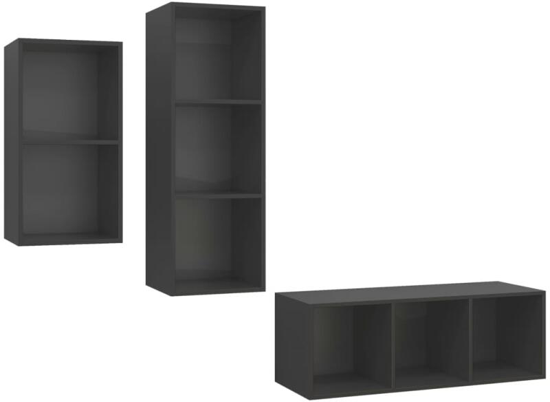 vidaXL 3 részes szürke forgácslap TV-szekrény szett A különféle tárgyak elrendezésére alkalmas, bőséges tárolókapacitással ellátott függő TV-szekrényszett biztosan praktikus és szemet gyönyörködtető kiegészítője lesz otthonának. A TV-szekrény falra szerelhető, így otthona időtlen kiegészítője lesz. Ez a hifi-szekrényszett ideális olyan tárgyak elhelyezésére