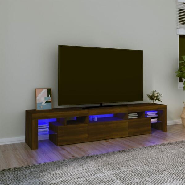 vidaXL barna tölgy színű TV-szekrény LED-lámpákkal 200x36,5x40 cm Ez a stílusos, mégis praktikus kialakítású LED-lámpákkal ellátott TV-szekrény minden bizonnyal szobája középpontjává fog válni. Praktikus anyag: A szerelt fa kivételes minőségű, sima felületű, szilárd, stabil, és ellenáll a nedvességnek. Színes LED-világítás: A TV-állvány RGB LED-világítással