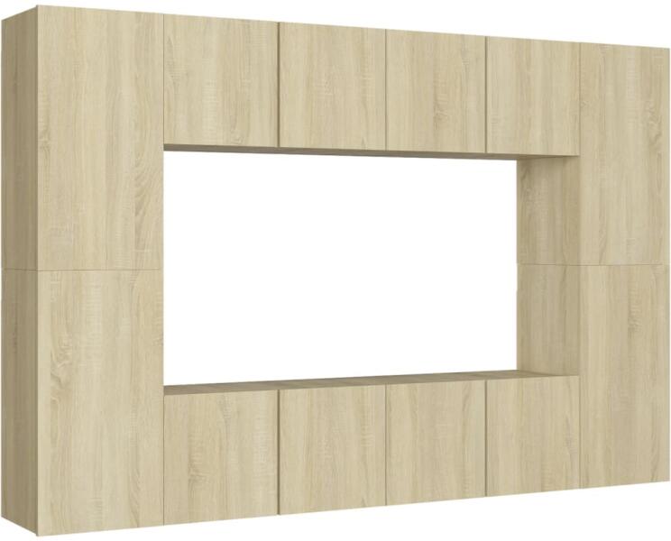 vidaXL 8 részes sonoma-tölgyszínű forgácslap TV-szekrényszett Ez a masszív TV-szekrényszett divatos, mégis praktikus kialakításával garantáltan szobája gyöngyszeme lesz. A TV-állvány a falra rögzíthető, így időtlen kiegészítője lesz otthonának. Széles tárolórekeszei ideálisak könyvek, magazinok, DVD-k és egyéb tárgyak tárolásához. A sztereószekrény nedves ruh