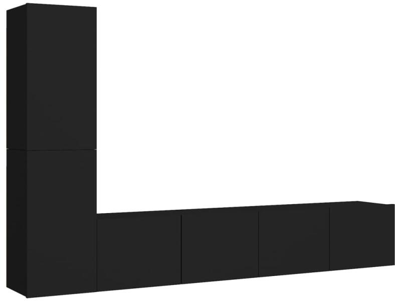 vidaXL 4 részes fekete forgácslap TV-szekrényszett A különféle tárgyak elrendezésére alkalmas, bőséges tárolókapacitással ellátott függő TV-szekrényszett biztosan praktikus és szemet gyönyörködtető kiegészítője lesz otthonának. A TV-szekrény falra szerelhető, így otthona időtlen kiegészítője lesz. Ez a hifi-szekrényszett ideális olyan tárgyak elhelyezésére va