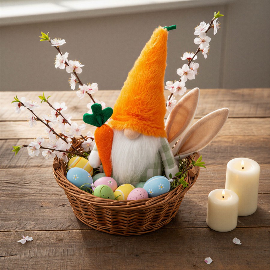 Textil dekoráció - manó - 25 cm Ez a bájos textil manó dekoráció tökéletes választás húsvéti vagy tavaszi dekorációként, amely vidám és barátságos hangulatot teremt otthonában, irodájában. A manó élénk narancssárga répa formájú sapkával és egy kis textil répával a kezében igazán egyedi és különleges megjelenést biztosít. Puha textil anyagból Vidám tavaszi