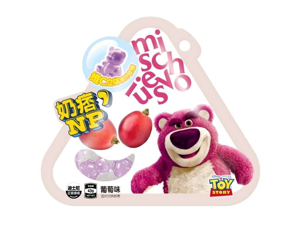 Disney Lotso Grape C vitamin 3D gumicukor Töltőtömeg: 43g Összetevők: Malátaszirup, Fehér cukor, Víz, Sűrített almalé (Gyümölcslé-tartalom ≥ 20%), Aroma, Élelmiszer-adalékanyagok (Savanyúságot szabályozó anyagok (E330, E331, E296), Tartósítószer (E202), Antioxidáns (E300), Zselésítőanyagok (E441, E440, E406), Édesítőszer (E420(ii)), Máz (E903), Színezékek (E102,