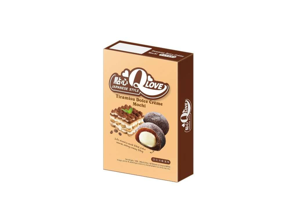 QLove Tiramisu Dolce Creme Deluxe Mochi Töltőtömeg: 180g Összetevők: maltóz, ragacsos rizsliszt, fehér csokoládé ízű töltelék (cukor, pálmaolaj, laktóz , tejpor , tejsavópor , kakaóvaj , emulgeálószerek (E322 ( szója ), E471, E476, E492)), cukor, víz, pálmaolaj, kakaópor, burgonyakeményítő, természetes aroma, kókuszolaj, tartósítószer (E202), emulgeálószer (E471),
