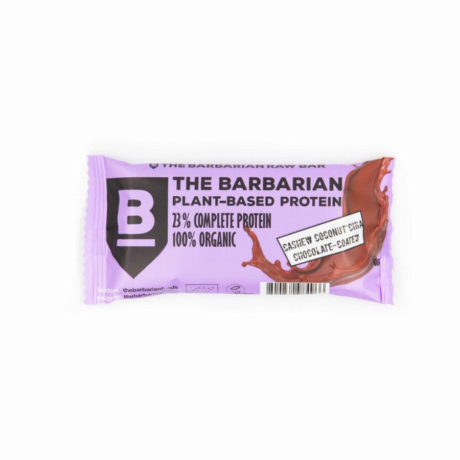 Bio étcsokoládéval bevont energiaszelet kesudióval, kókusszal és (chia) aztékzsálya-maggal Összetevők: Fehérjekeverék* 21% (borsó- és rizsfehérje változó arányban), datolya*, agavészirup*, kesudió* 15%, kókuszpehely* 13%, étcsokoládé* 12% (kakaómassza* 44%, nyers nádcukor* 26,2%, kakaóvaj* 18,6%, kakaópor* 11,2%, vaníliakivonat* 0,02%), aztékzsálya-mag (chia)* 4%, Hi