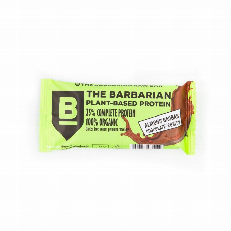 Bio étcsokoládéval bevont energiaszelet mandulával és baobabbal Összetevők: Datolya*, fehérjekeverék* 24% (borsó- és rizsfehérje változó arányban), mandula* 16%, agavészirup*, étcsokoládé* 12% (kakaómassza* 44%, nyers nádcukor* 26,2%, kakaóvaj* 18,6%, kakaópor* 11,2%, vaníliakivonat* 0,02%), baobab* 2%, Himalája só. *organikus gazdálkodásból. Nyomokban földimogyorót,