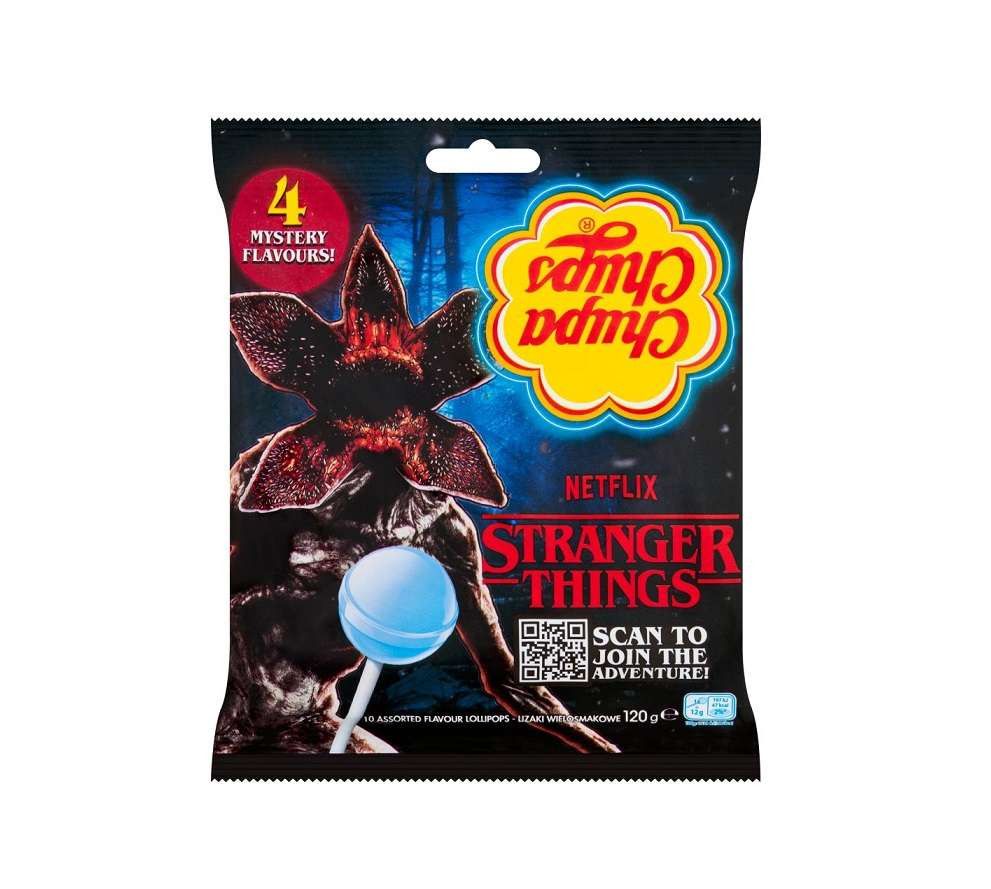 Chupa Chups Stranger Things 4 ízű nyalóka csomag Töltőtömeg: 120g Ízek a csomagban: Cseresznye, málna, meggy és kóla. Összetevők: gyümölcsös nyalókák : cukor, glükóz szirup, gyümölcs püré koncentrátumból 3% (alma, cseresznye, málna, ananász, lime, citrom, eper, barack, banán, narancs, áfonya, szeder, mangó, görögdinnye, kiwi), sav (tejsav, citromsav, almasav), konce
