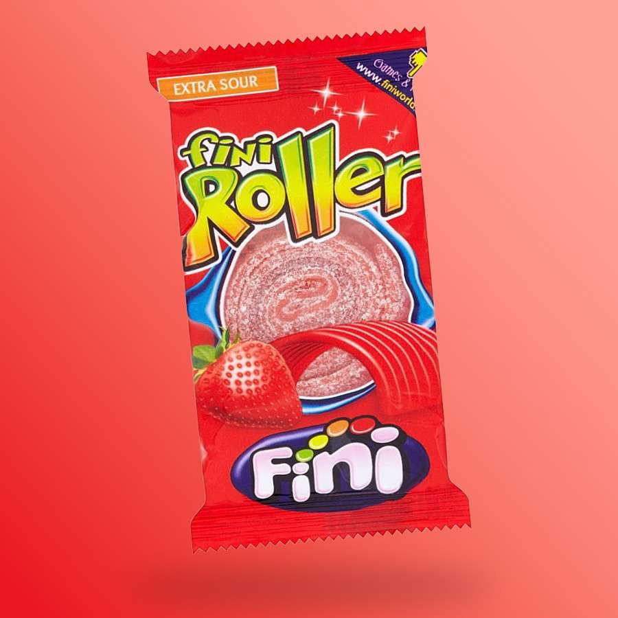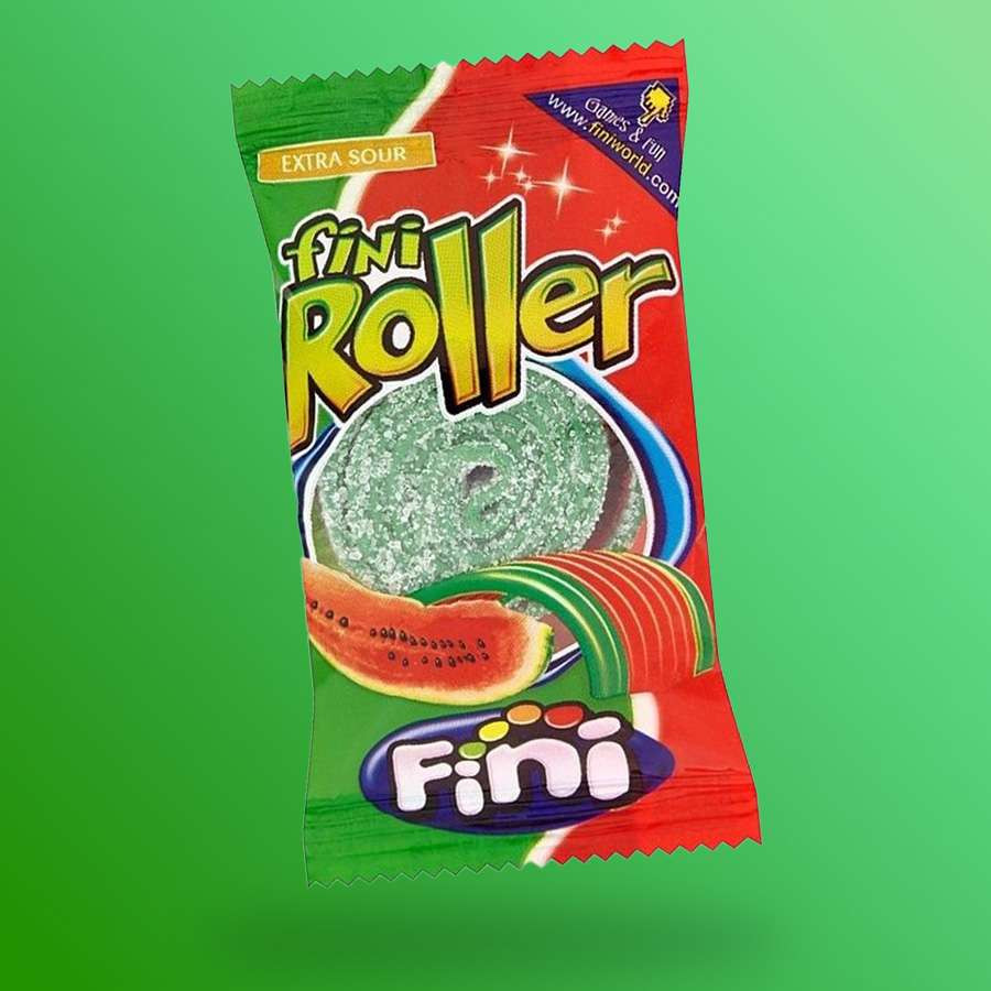 Fini Roller görögdinnyés savanyú gumicukor töltőtömeg: 20g Összetevők: glükóz- és fruktózszirup,cukor, búzaliszt, módosított kukoricakeményítő, étkezési sav: E296, laktóz, növényi zsír, étkezési sav: E 330, E 270, savanyúságot szabályozó anyag: E 325, E 331, só, emulgeálószer: E471, nedvesítőszer: E422 színezék: E131, E101. Átlagos tápérték 100 g-ban Energ
