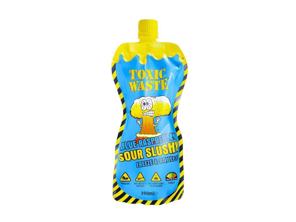 Toxic Waste Sour Slushy Blue Raspberry kék málna ízű savanyú jégkása Űrtartalom: 250ml Gyümölcsízű ital édesítőszerekkel - természetesen előforduló cukrokat tartalmaz - a tökéletes slush elkészítéséhez vigye haza és fagyassza le legalább 4 órán át. Ha a tasak teljesen megfagyott, olvassza ki 25 percig szobahőmérsékleten. Nem ajánlott 4 éves kor alatti gyermekek sz