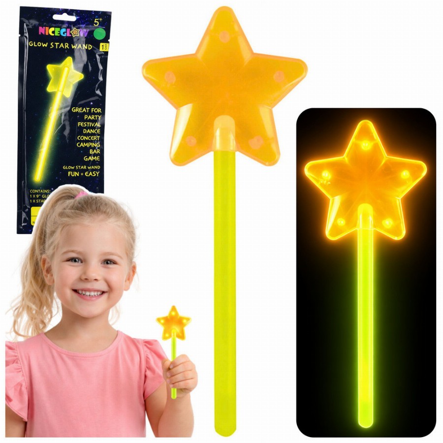Glow-in-the-Dark Fluorescent Star Wand Stick Neon 22cm Glow Stick Neon Fluorescent Glow Stick WandThis striking star-tipped wand is a unique glowing gadget perfect for parties, outdoor events, festivals, and themed parties. Thanks to glow stick technology, the product is activated by bending the stick, releasing an intense, neon light visible in the dark, without the need for batteries.The fluores