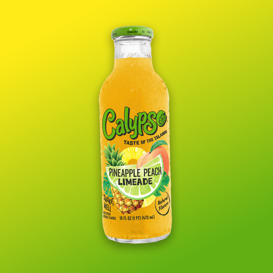 Calypso Pineapple Peach ananász és barack ízű limonádé. űrtartalom: 473ml Összetevők: szűrt víz, cukor, limelé koncentrátum (4,0%), savanyúságot szabályozó anyag (citromsav), természetes aromák, citruspép (0,2%), emulgeálószer (módosított keményítő), ananászlé koncentrátumból, őszibaracklé koncentrátumból, szín (E160e, E160a, E150d). Átlagos tápérték 100ml-b