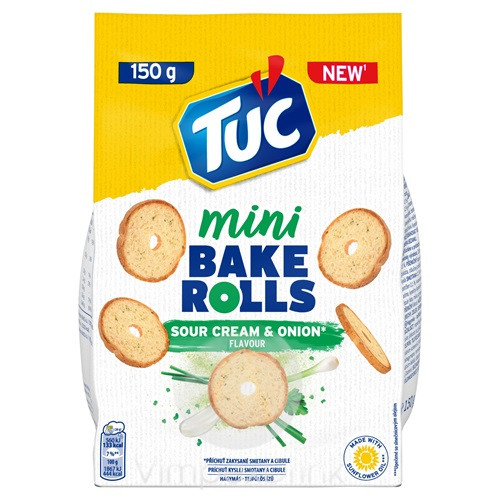TUC MINI BAKE ROLLS Hagym.-Tejföl 150 g Rövid leírás Ropogós mini rollok hagymás-tejföl ízvilággal, amelyek gyors és élvezetes nassolást kínálnak. A praktikus 150 g-os csomag könnyen beilleszthető a mindennapokba, legyen szó uzsonnáról, egy gyors snackről vagy petti-filmekhez való kísérőről. Fő jellemzők Ropogós textúra és egyensúlyban kevert hagymás-tejföl íz. K