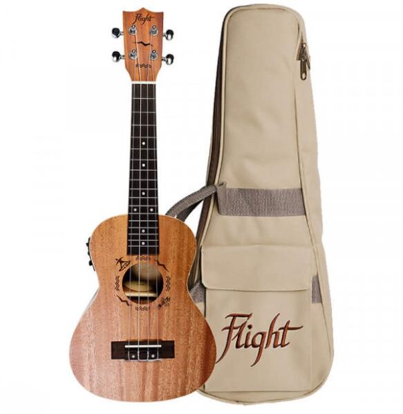 Flight DUC323 CEQ MAH/MAH elektro-akusztikus koncert ukulele Test: Mahagóni Hátlap és káva: Mahagóni Nyak: afrikai okoume Fogólap: Dió, 17 bund Húrláb: Dió Felső nyereg és húrtartó: Csont Flight FU-T3 pickup Tartozék tok