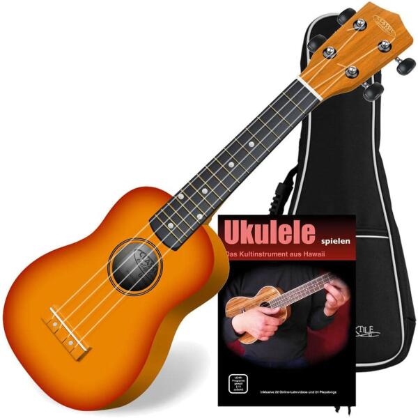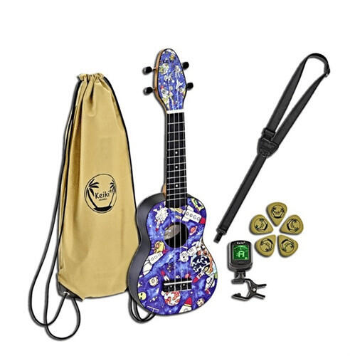 Guglielmo Gasloli grafikus által készített egyedi festés Szoprán ukulele Agathis fedlap ABS enyhén ívelt oldal- és hátlap Okoume nyak ABS fogólap és híd Tartozékok: hordtáska 5 db pengető hanglyuk heveder csíptetős hangoló