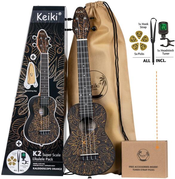ORTEGA KEIKI K2SS-OKC Ukulele Szett "Orange Kaleidoscope" KEIKI K2 Series Superscale Soprano Ukulele Set - Agathis / Orange Kaleidoscope A K2-sorozatunk részeként a K2SS ukulelék mindenki számára nagyszerű hangszerek. Ezek a modellek abban különlegesek, hogy szuperskálás méretük van, ami azt jelenti, hogy szoprán testük van kombinálva egy összehangolt nyakkal és fogólappal. Ez a