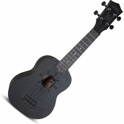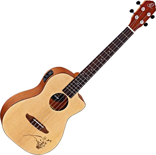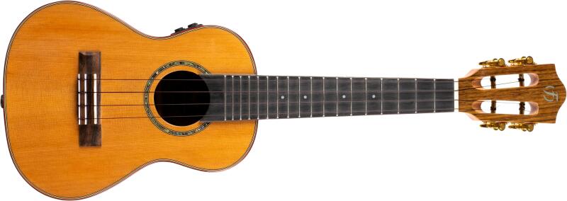 Frets: 12 Tuning: A-D-F#-B Top: Okoume open pore satin Back & Sides: Okoume open pore satin Feature: Laser engraved tortoise Fretboard & Bridge: Walnut Tuning Machines: Open Gear with black knobs Scale: 284mm Width at nut: 32mm Strings: Ortega Guitars UWNY-4-SO strings
