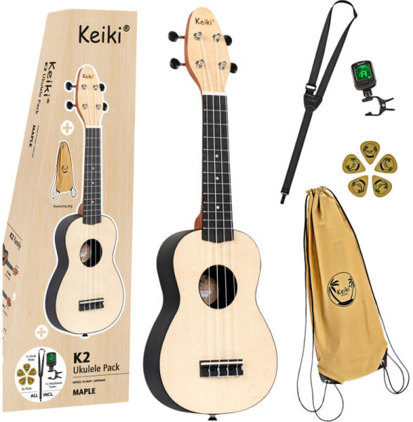 A K2-MAH és K2-MAP ukulelék a Keiki® K2 sorozatunk legújabb darabjai. A világos juhar és a sötét mahagóni fedőlap a masszív ABS testtel együtt tiszta hangzást és gyors megszólalást biztosít, emellett természetes megjelenést kölcsönöz. Az ukulele fejhangolóval, hanglyukra akasztható pánttal/támasszal, 5 közepes pengetővel és húzózsinóros táskával érkezik. Műszaki