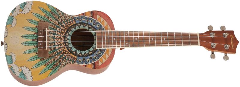 Típus: szoprán ukulele Test: Sapelli Nyak: Sapelli Motívum: Tropical Waves Fogólap és híd: fekete dió Menzúra: 344mm Felsőnyereg szélessége: 35mm Kiképzés: matt selyemfényű lakkozás Tartozék: puhatok