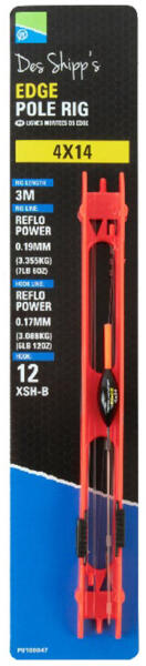 Preston 4x14 Edge Pole Rig Rakós Botos Úszó Előkötött Szerelékkel: Dura oldalsó szemmel Tartós anyagból Reflo Power zsinórral Könnyen használható Carbon szárral A legkifinomultabb alkatrészekbol összeállított rakósbotos előkötött szerelék, amely Des Shipp nevéhez fuzodik. Ezek a pontyos szerelékek tökéletesen alkalmasak, bármilyen vízterületen. Az úszók az új Dura
