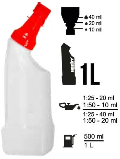 Univerzális keverőedény, amely alkalmas benzin-olaj keverék keverésére 2 ütemű motorokhoz. Térfogata 1 liter. A fő tartály (fehér) az üzemanyag mérésére szolgáló műszerekkel van felszerelve, a piros kupak pedig az olaj mérésére szolgáló műszerekkel. Az olajat és az üzemanyagot ezután a tartályban lehet összekeverni, és az olajat a kupakon lévő dugó segítségével