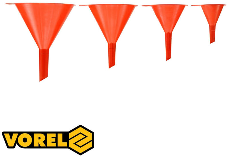 műanyag tölcsér készlet, 4 részes tölcsér átmérők: 52, 76, 100, 120 mm 4 db, különböző átmérőjű (52, 76, 100, 120 mm) univerzális műanyag tölcsérből álló készlet. Hasznos otthon, garázsban és műhelyben.