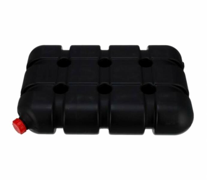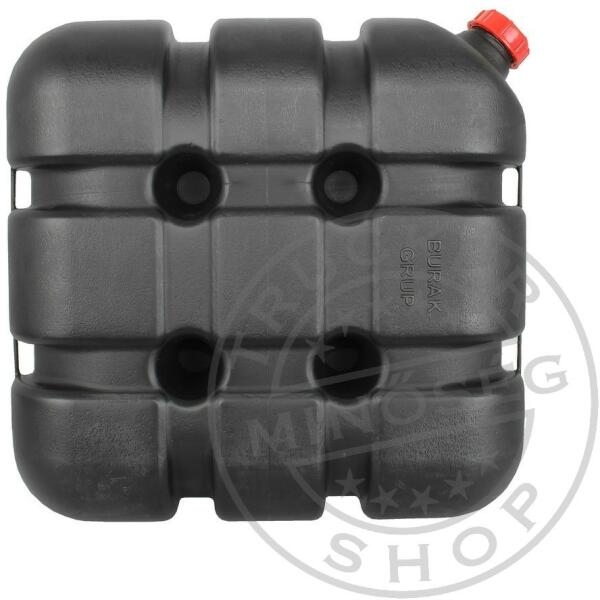 Kiegészítő műanyag üzemanyag tartály. Tetszőleges helyre beszerelhető csavaros csonkkal (6 mm belső átmérőjű gumitömlő számára). Strapabíró, időjárásálló műanyagból. Ideális állófűtéshez, de kistraktoron, targoncán, kerti és munkagépeken is használható. Lapos kivitele miatt könnyen elhelyezhető. Javasolt szerelési helyzet: álló, napfénytől védett Mérete