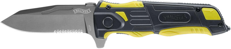 Termék részletekA Walther Pro Rescue egy fejlett mentőkés , amely fogazott pengével, sürgősségi üvegtörővel és kihúzható pengével rendelkezik a biztonsági övek vágásához. A kés nagyméretű (95 mm-es) 12C27 rozsdamentes acélból készült csepppontot használ . Ez a svéd rozsdamentes acél nagy keménységgel, jó kopásállósággal és rendszeres keményfémeloszlással rendelkezik, ami gar
