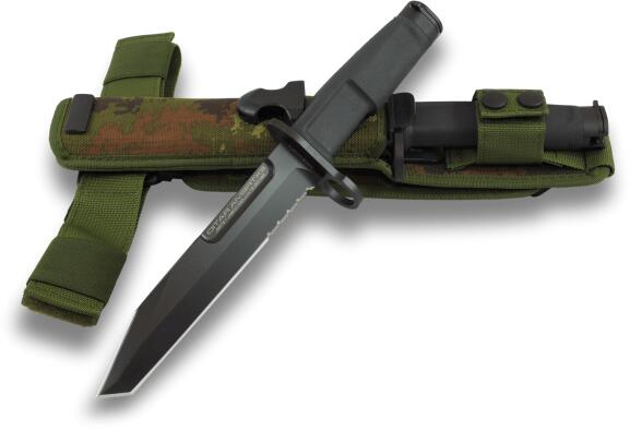 Taktikai bajonett kés Extrema Arány FULCRUM BAYONET EI BLACK az olasz hadsereg számára. Bohler N690 acélból készült, éles, szilárd pengével, részleges fúrásokkal. Ferenc műanyagból készült, fekete fogantyúval, kettős pajzsmal. A Cordura esethez tartozik.