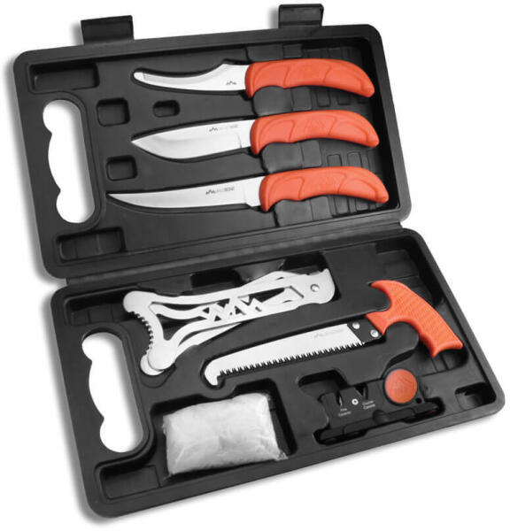 Termék részletekA nyolc darabból álló Jaeger Pak késkészlet ideális megoldás a teljes vadfeldolgozáshoz. Tartalmaz egy nyúzó kést, zsigerelő kést, csontozó kést, csontfűrészt, mellkasnyitót, eldobható kesztyűt és egy kompakt csiszolót. Egyszóval egy komplett készlet minden vadász számára egy csomagolásban. A pengék 420J2 rozsdamentes acélból készülnek, amely jó vágási tulajdons