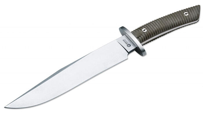 Böker Arbolito El Gigante Micarta Bowie kés Az El Gigante egy Bowie kés. A Bowie kés. Amerika ikonikus késes jelképe. A vadnyugat egy szeletkéje. Manapság inkább outdoor mindenes vagy vadászkés. Minden, a Bowie késekre jellemző ismertetőjel megtalálható a késen. A hatalmas clip point penge, aminek rozsdamentes 440C acél az anyaga. A karakán rozsdamentes keresztvas. Az egyszerű