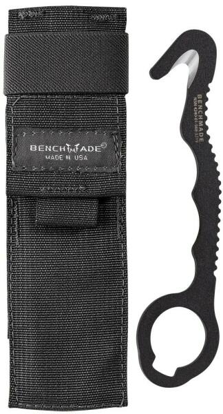 Benchmade Strap Cutter-Long FB 8 kompakt mentőeszköz egy darabban 440C-os rozsdamentes acélból, fekete porszórt bevonattal. Horoggal a kötelek vagy puha anyagok vágásához, hátul fogazott, a fogantyúján pedig lyuk található a jobb fogás érdekében. Tépőzáras (Velcro) nylon tokkal és lánccal, amely MOLLE kompatibilis.